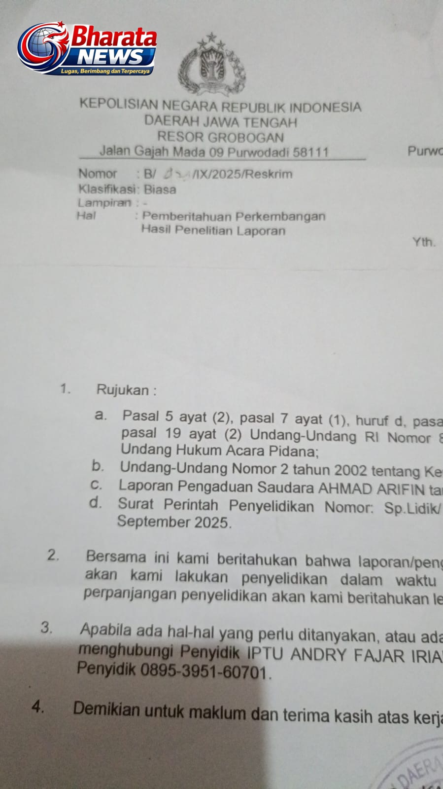 Menanggapi hal itu, Kasat Reskrim Polres Grobogan, *Risky Ari Budianto*, sebelumnya menyatakan bahwa pihaknya akan menindaklanjuti laporan tersebut secara profesional.